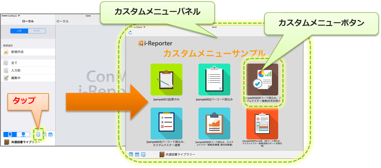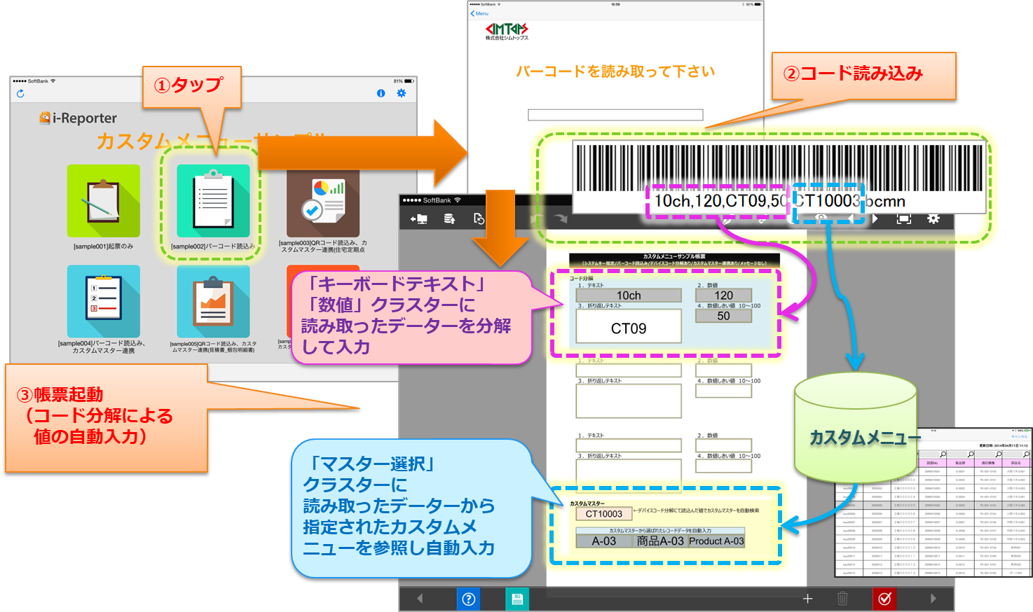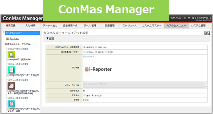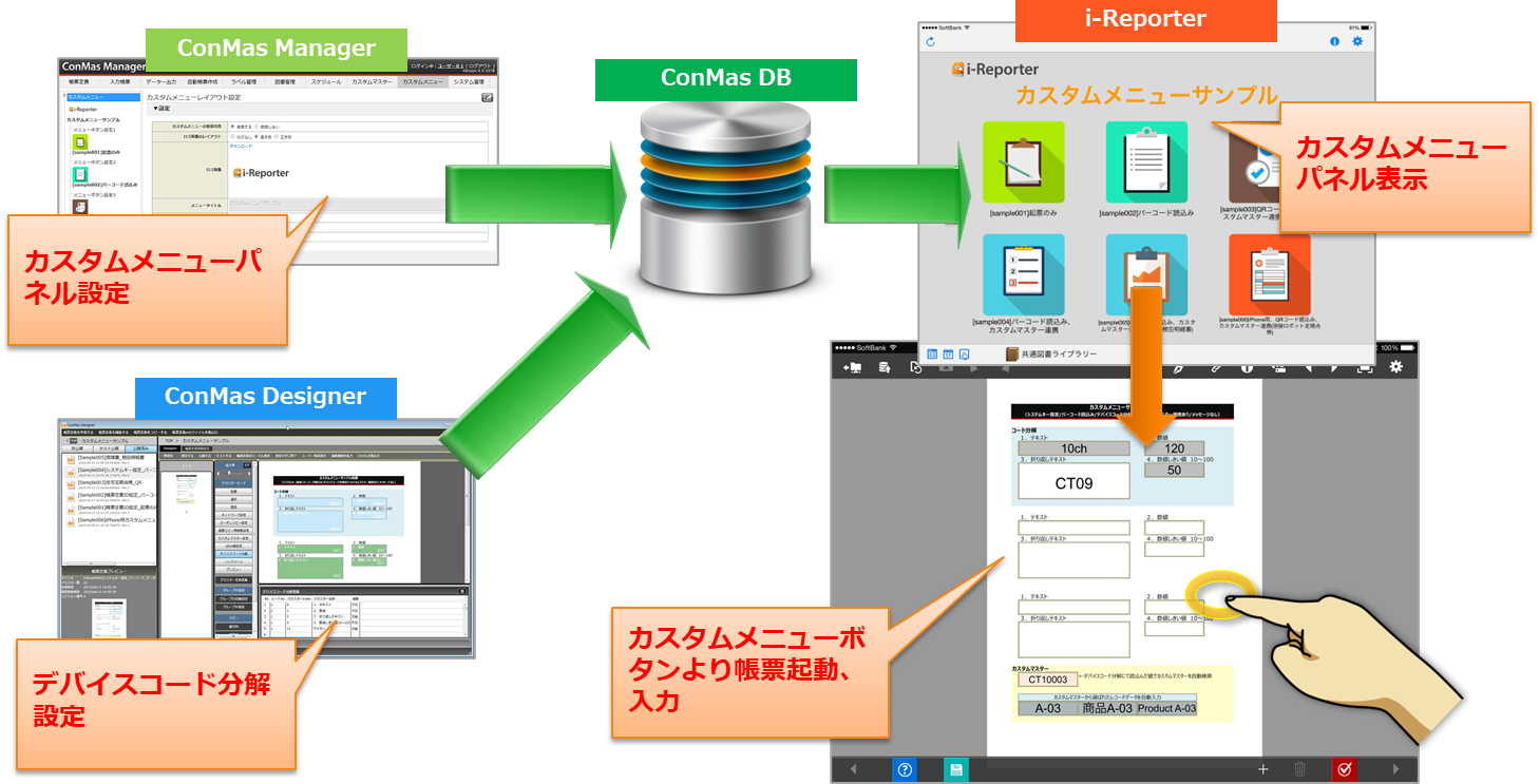 カスタムメニューは、ConMas Manager で作成します。 i-Reporterアプリは、その設定情報をダウンロードして使用します。 デバイスが読み取ったコードを帳票の各クラスターにどのように分解するかの設定は、ConMas Designer で帳票定義に設定します。