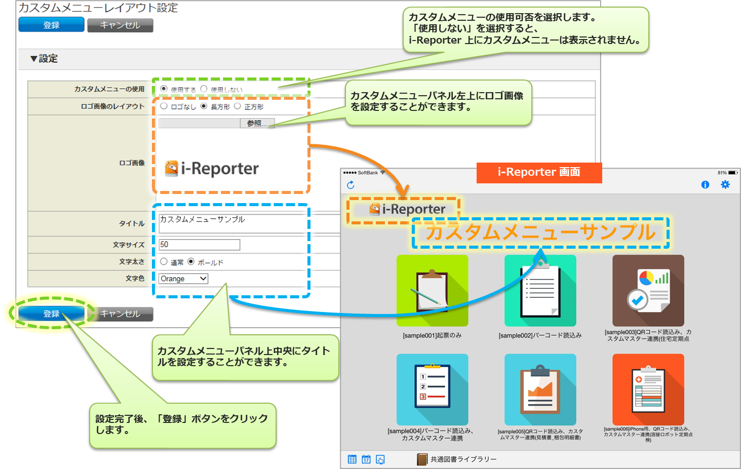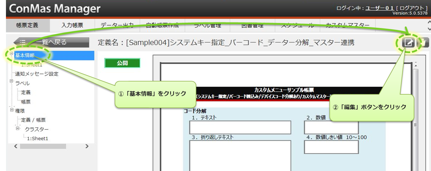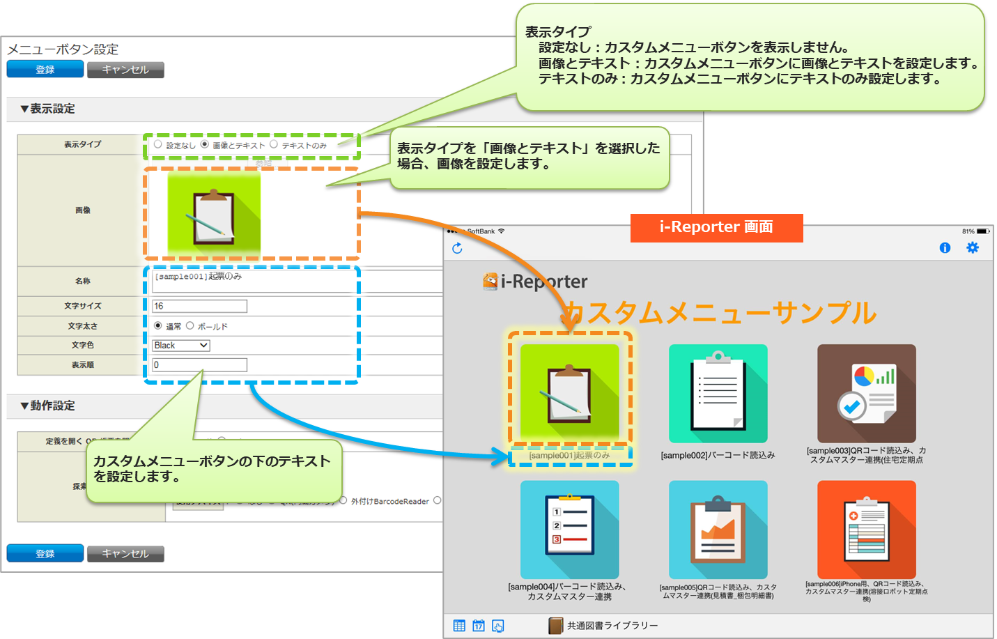 カスタムメニューは、ConMas Manager で作成します。 i-Reporterアプリは、その設定情報をダウンロードして使用します。 デバイスが読み取ったコードを帳票の各クラスターにどのように分解するかの設定は、ConMas Designer で帳票定義に設定します。