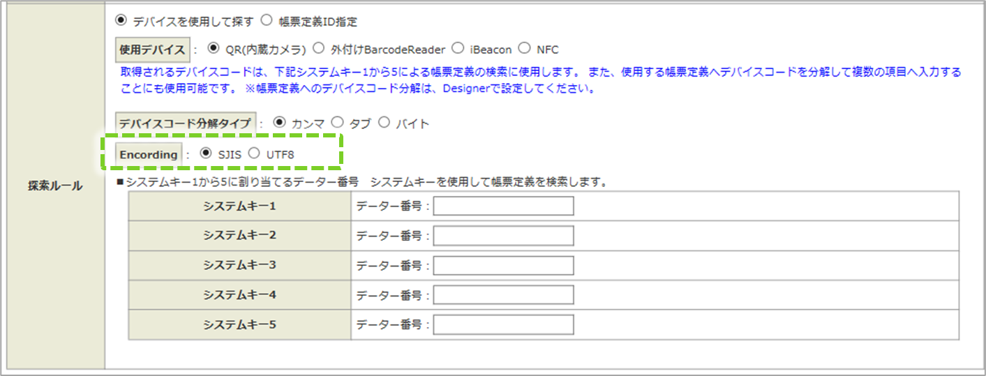 • SJIS 読み取ったデバイスコードを「SJIS」でエンコーディングします。