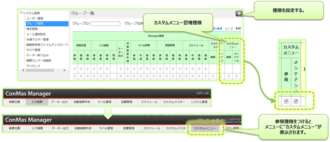 ConMas Managerでのカスタムメニューの管理権限設定