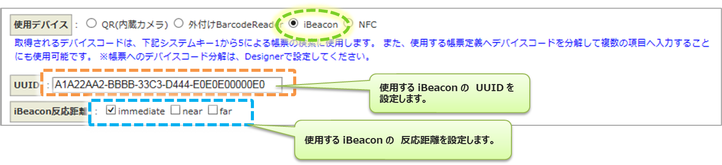 デバイスコードを読みとるデバイスが 「iBeacon」 の場合、使用する iBeacon の UUID と iBeacon の反応距離を指定します。