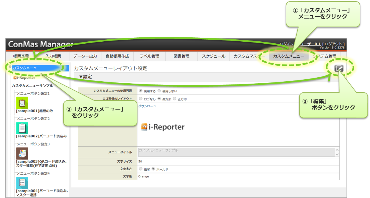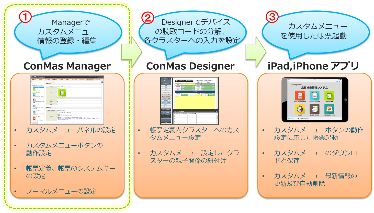 ConMas Manager、ConMas Designer、i-Reporter アプリでのそれぞれの役割と設定・操作は大きく以下のような流れで行います。 ここでは、「①Managerでカスタムメニュー情報の登録・編集」について説明します。
