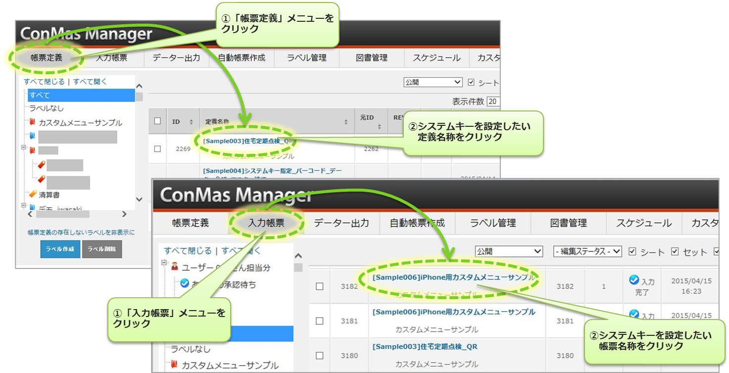 システムキーとは、カスタムメニュー機能で使用する帳票定義、入力帳票を検索するための検索キーのことです。 システムキーは、ConMas Manager より帳票定義、入力帳票に設定します。