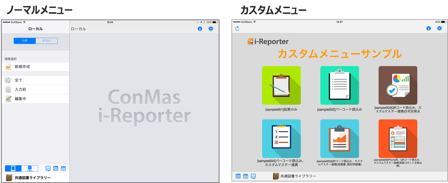 「カスタムメニュー」に対し、従来の i-Reporter 起動時に表示されていた画面を「ノーマルメニュー」と呼びます。