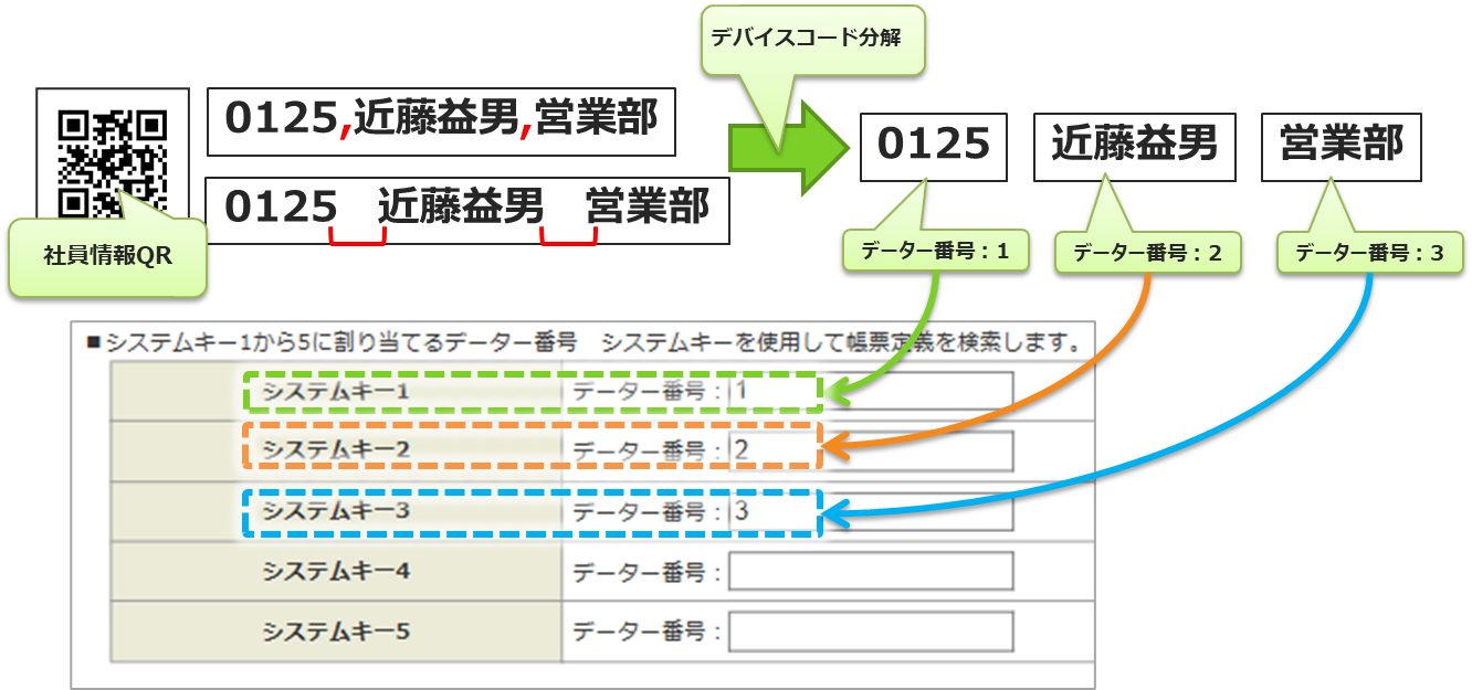 • 帳票起動時に、読み込んだデバイスコードの値を分解し、分解先クラスターに自動入力