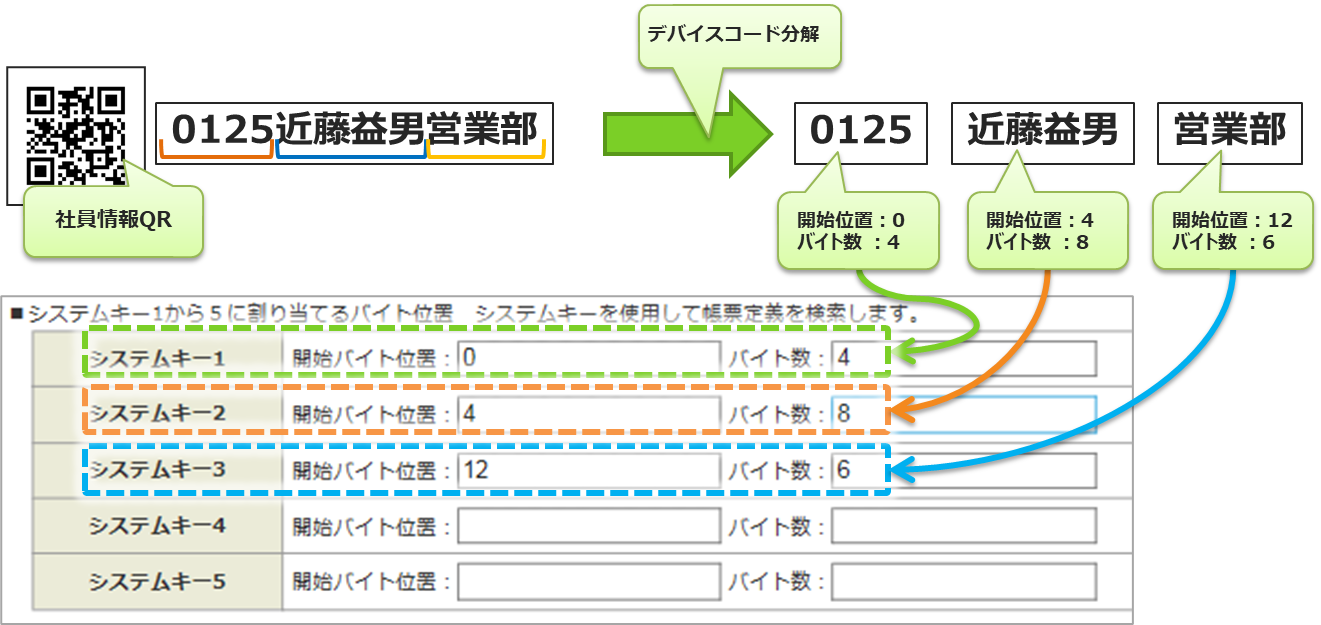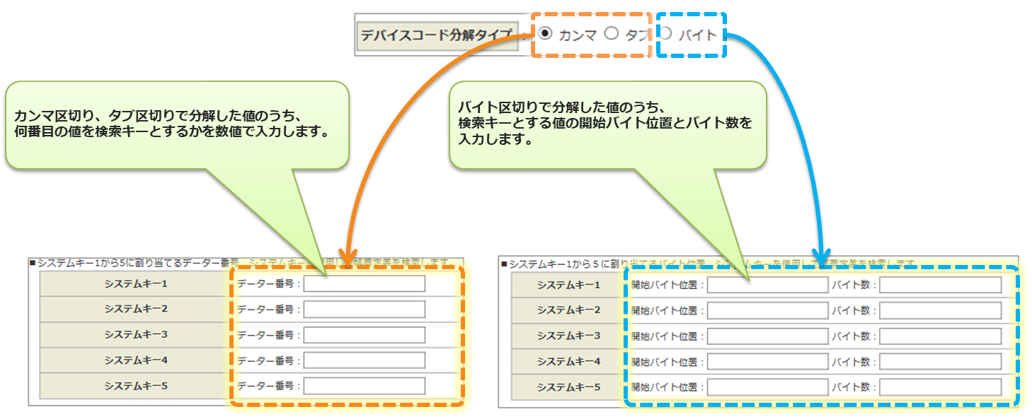 • 分解したデバイスコードの値と、呼び出す帳票定義に設定されているシステムキーとの比較位置を指定します。