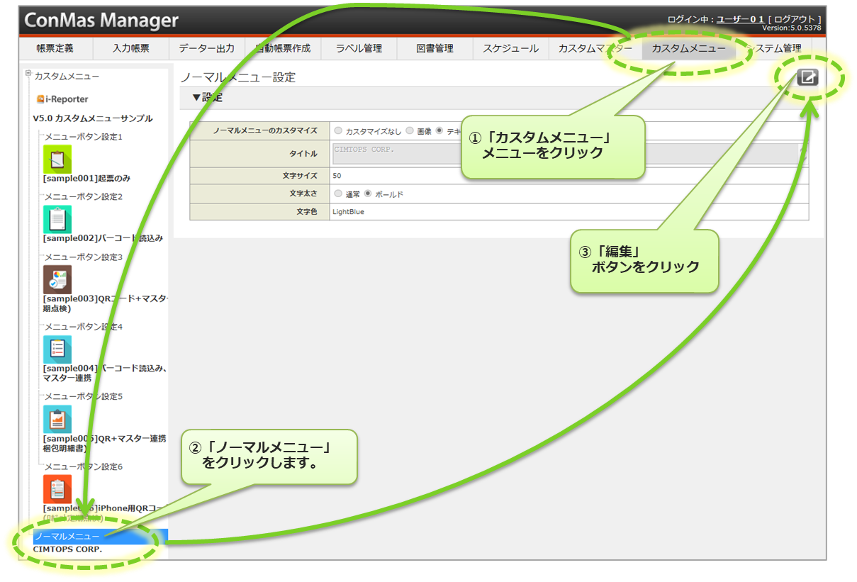 ConMas Manager メニューの「カスタムメニュー」タブより、カスタムメニューボタンの設定を行います。