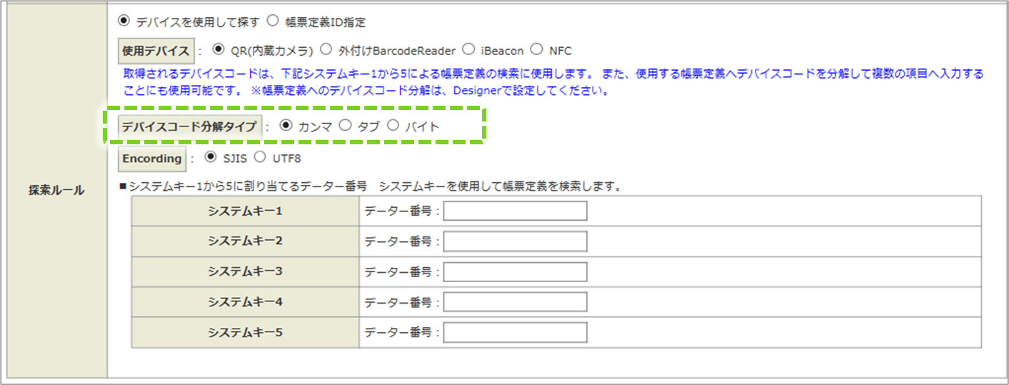 システムは、デバイスコード分解した値と、帳票定義、入力帳票に設定されているシステムキーが一致する帳票定義、入力帳票を検索します。 帳票定義、入力帳票に設定されているシステムキー1 ~ システムキー5 のうち、検索対象とするシステムキーの入力欄に、デバイスコード分解した値のうち、検索キーとする値を指定するための情報を入力します。 検索キーとする値を指定するための情報は、「デバイスコード分解タイプ」によって異なります。