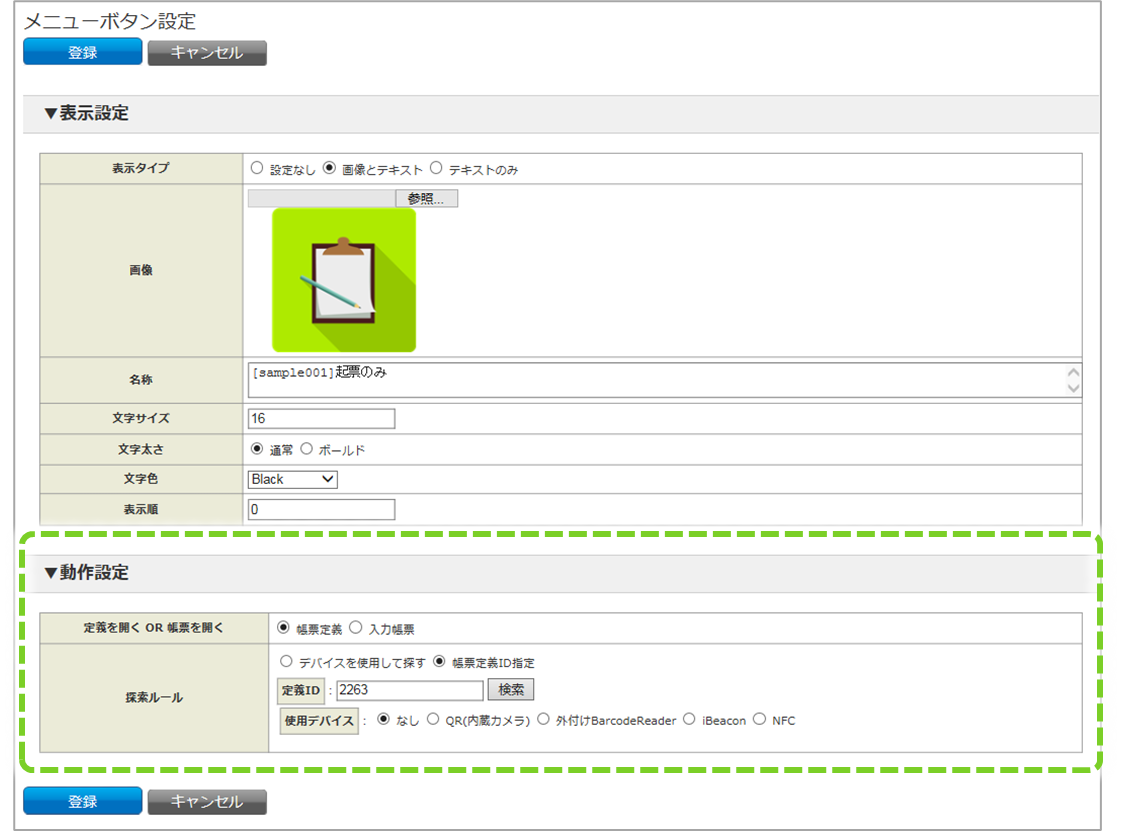 カスタムメニューボタンより、帳票定義を呼び出すか、入力帳票を呼び出すかを設定します。 「帳票定義」を選択した場合は、帳票定義より新規帳票を作成して起動します。 「入力帳票」を選択した場合は、入力帳票を起動します。