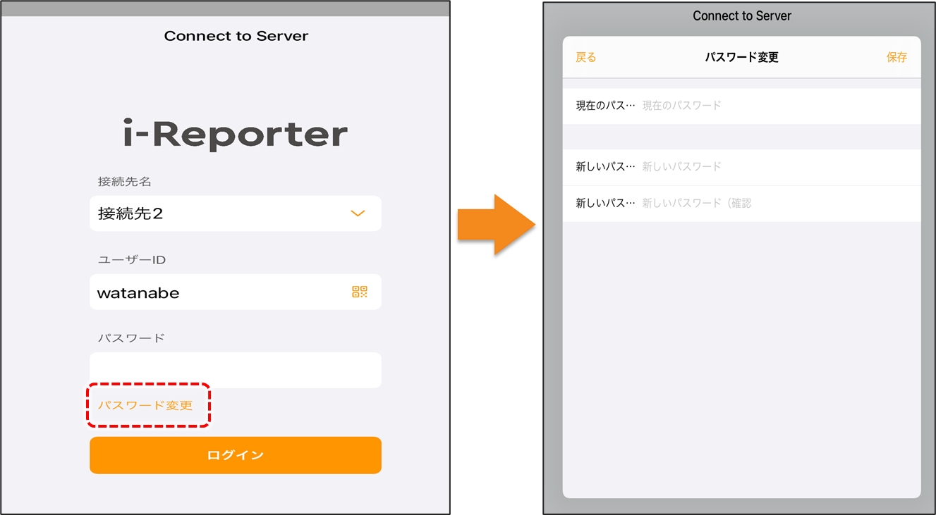 ConMas Managerでパスワード変更に関する設定が有効になっている場合、パスワード欄に「パスワード変更」ボタンが表示され、アプリからパスワードを変更できます。