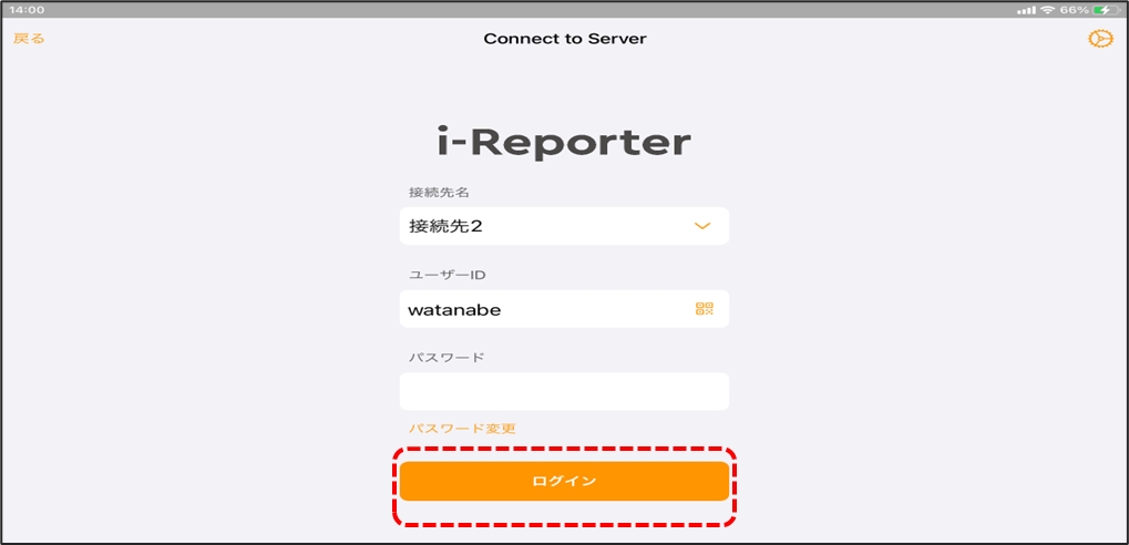 ログイン画面が表示されます。 ユーザーIDとパスワードが空欄の場合は、この画面で入力するか、「接続先設定」に戻って入力します。