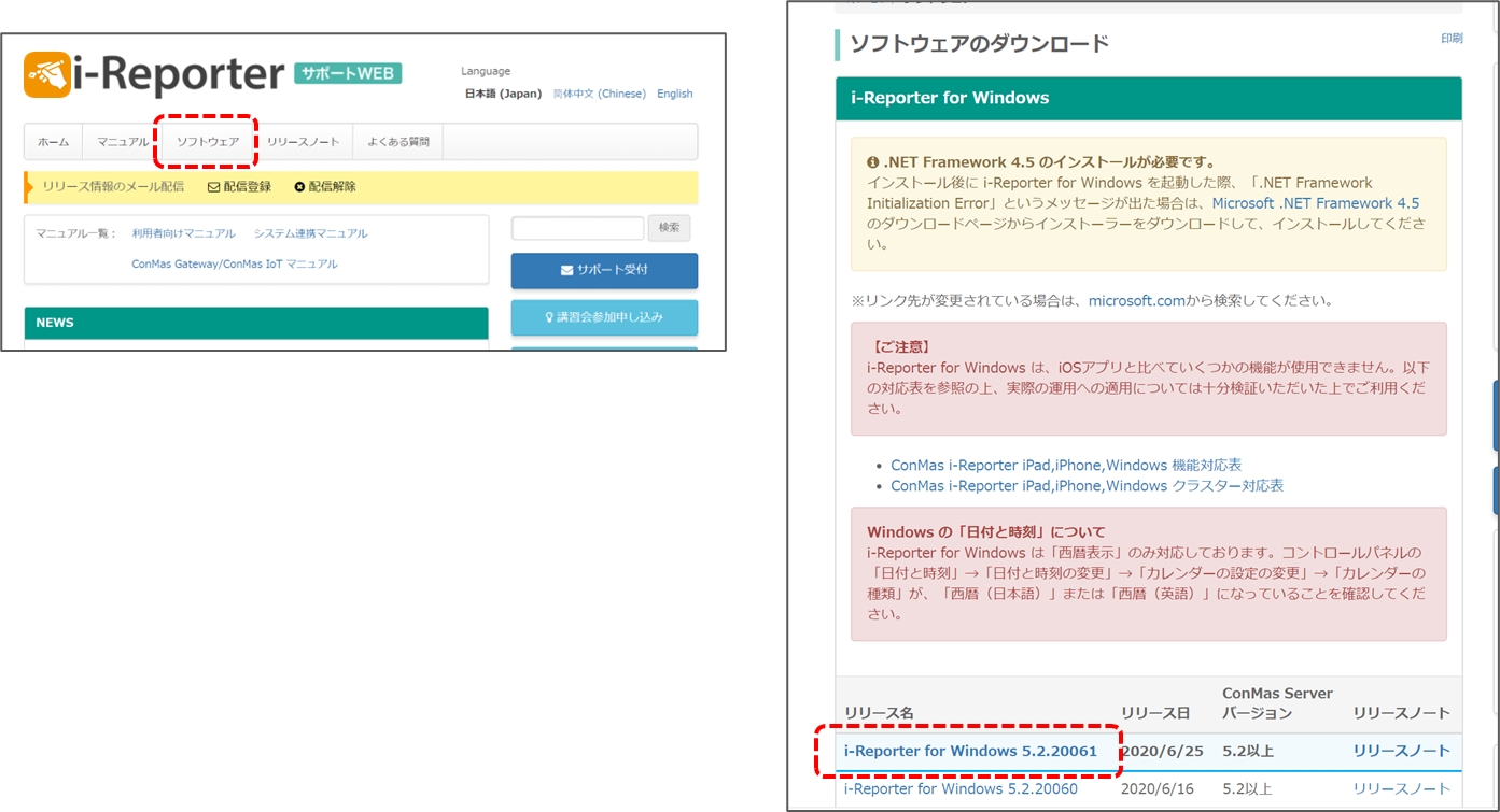 サポートWEBの「ソフトウェア」ページを開き、インストールするバージョンをタップしてインストーラーをダウンロードします。 以下は、バージョン5.2.20061の例です。