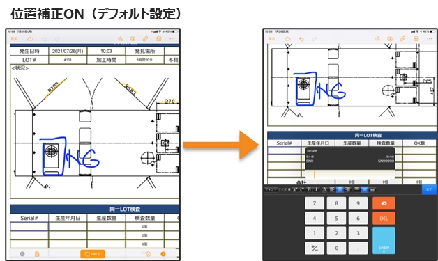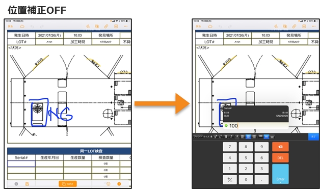 位置補正OFFの場合、位置補正が行われないため帳票画面が動かないまま入力が可能です。 図面を固定位置で確認しながら、各クラスターを入力する場合などに適しています。