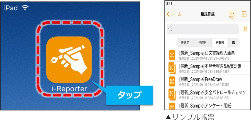 ホーム画面から、「i-Reporter」をタップして起動します。 初回起動時は黒い画面が表示され、サンプル帳票のインストールが行われます。 インストールは数秒で完了します。