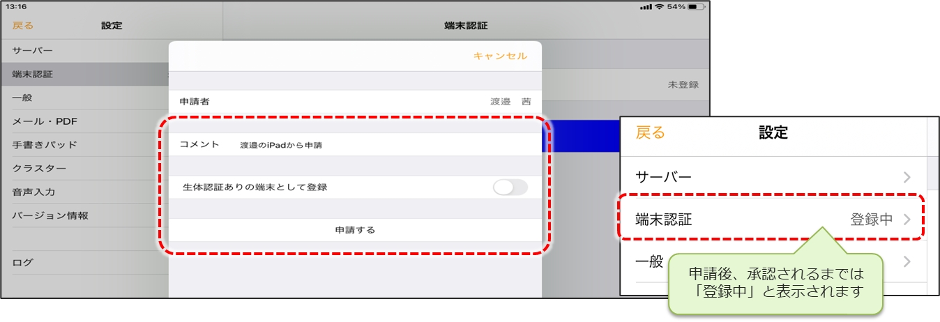 申請後、管理者によって承認されるまでのあいだ、アプリでのログインはできますが、帳票データー等の閲覧や取得はできません。