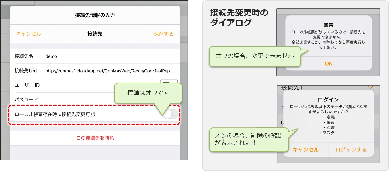 接続先を変更するとタブレットのローカルに保存されている帳票はすべて削除されます。