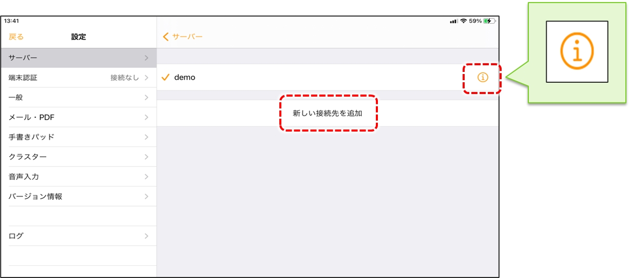 「接続先名」をタップすると、接続先一覧が表示されます。 インストール直後は名称「demo」の接続先が登録されています(iOS版のみ)。