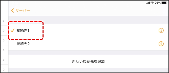 接続先一覧画面で変更したい接続先名をタップして切り替えます。 選択中の接続先名の左にオレンジのチェックマークが表示されます。