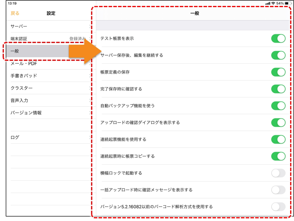 設定では接続先の他、i-Reporter アプリの動作を設定できます。 帳票ライブラリー、帳票編集画面で画面左上の歯車アイコンをタップして設定画面へ移動します。 設定の左メニューから「一般」を選択すると、右側に一般設定の項目が表示されます。