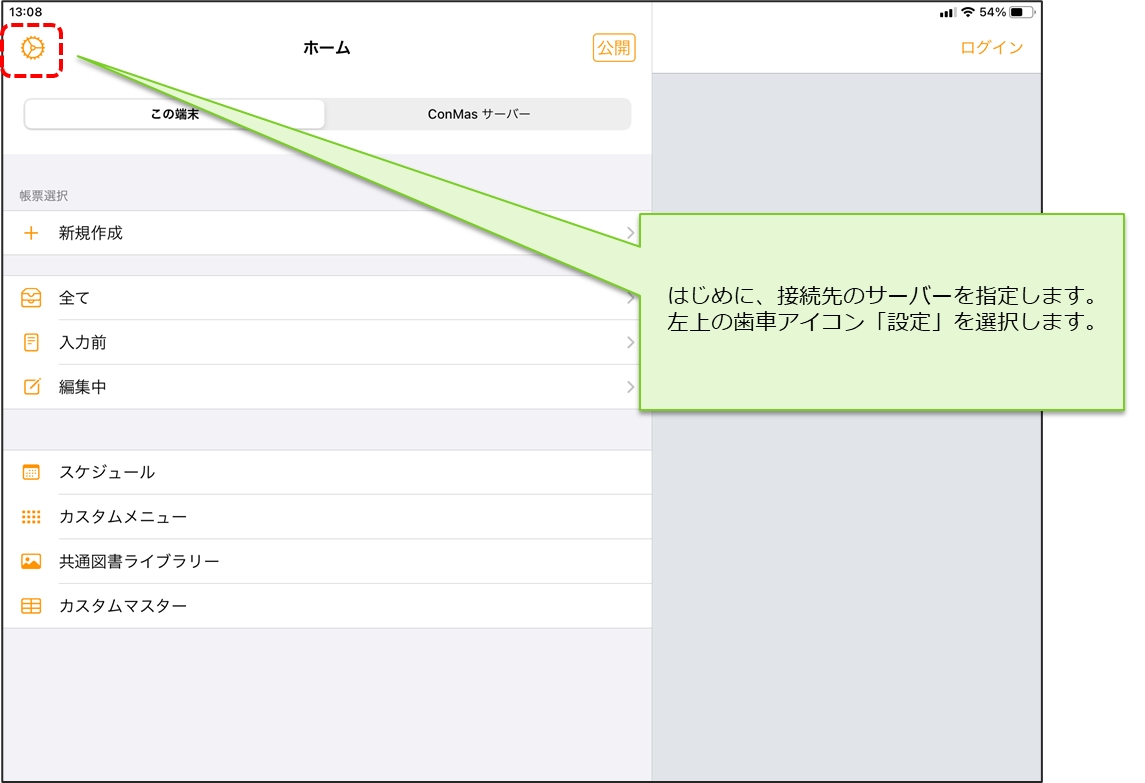 はじめに、ConMasサーバーへ接続するための「接続先サーバー URL」を指定します。 i-Reporterアプリを起動した後、左上の「歯車(設定)」アイコンをタップします。