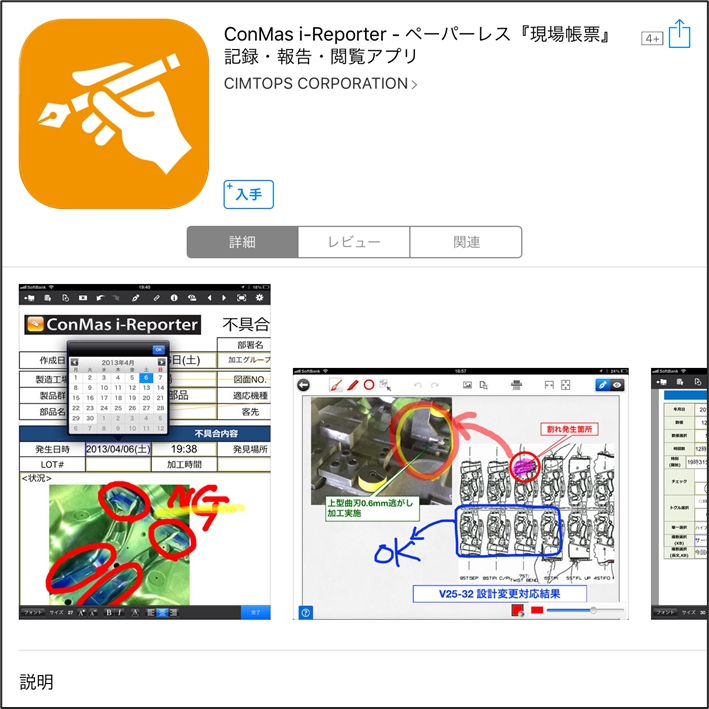 App Storeで「ConMas i-Reporter」と検索して、「入手」ボタンでインストールしてください。 ConMas i-Reporter アプリは無料です。