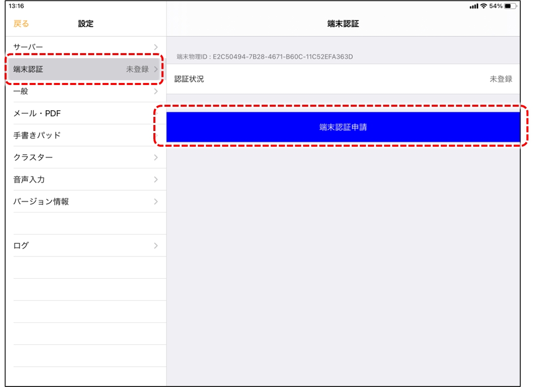 設定画面左のメニュー「端末認証」をタップします。申請前は「未登録」と表示されています。 画面右側が「端末認証」に変わります。青い「端末認証申請」をタップします。