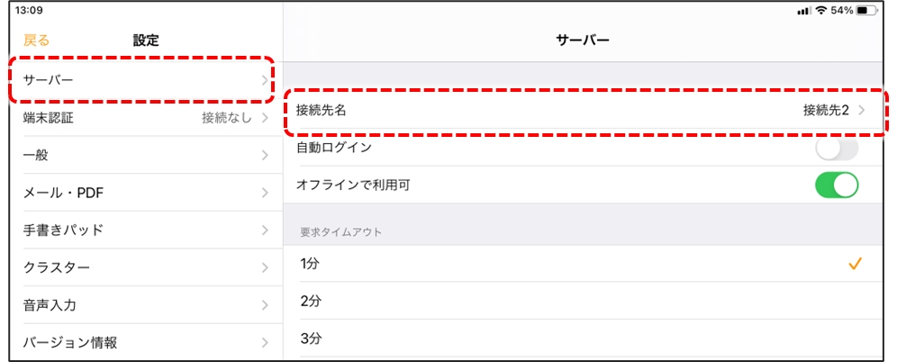 要求タイムアウト 要求タイムアウト時間を設定することができます。 要求タイムアウト時間とは、サーバー接続を行い、サーバーの返答を待つ時間となります。 標準時間は1分です。 使用例)サーバー保存する帳票のクラスター数・ページ数・画像数が多い場合、 サーバー保存時に要求タイムアウトが発生することがあります。 その場合は、1分~5分で設定を調整します。