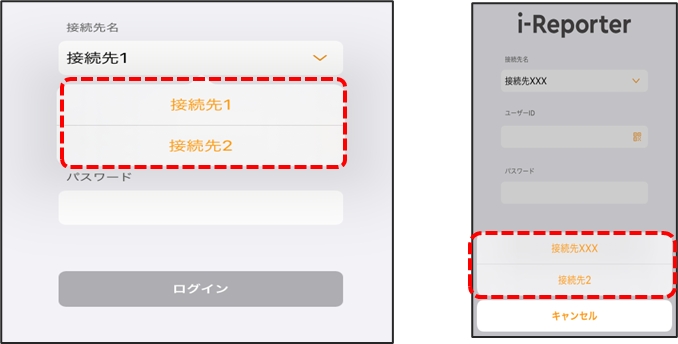 接続先が複数ある場合、ログイン画面の「ユーザーID」の上に現在の「接続先名」が表示されます。 タップするとリストが表示されるので、変更したい接続先名をタップして切り替えます。