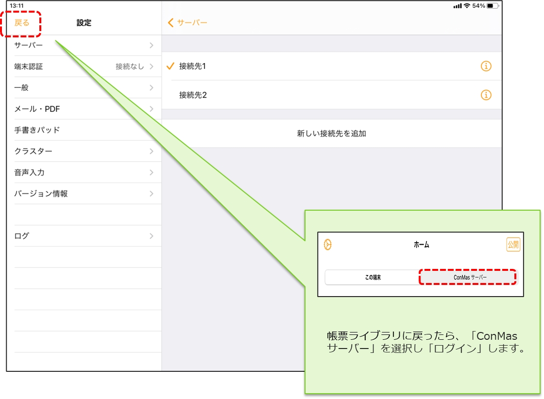 接続先設定後、画面右上の「戻る」をタップして帳票ライブラリーに戻り、「ConMas サーバー」を選択してi-Reporterアプリに「ログイン」します。