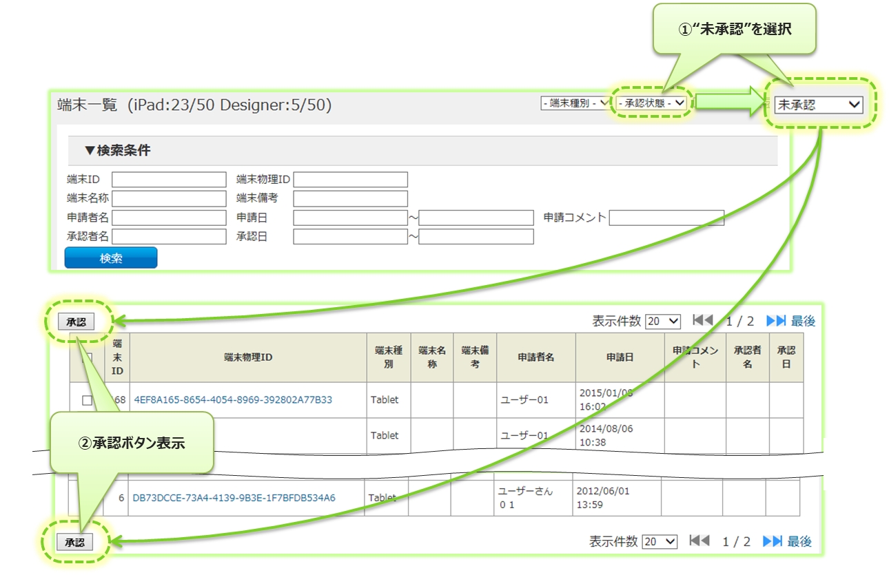 端末一覧上で未承認端末を対象に一括承認することができます。