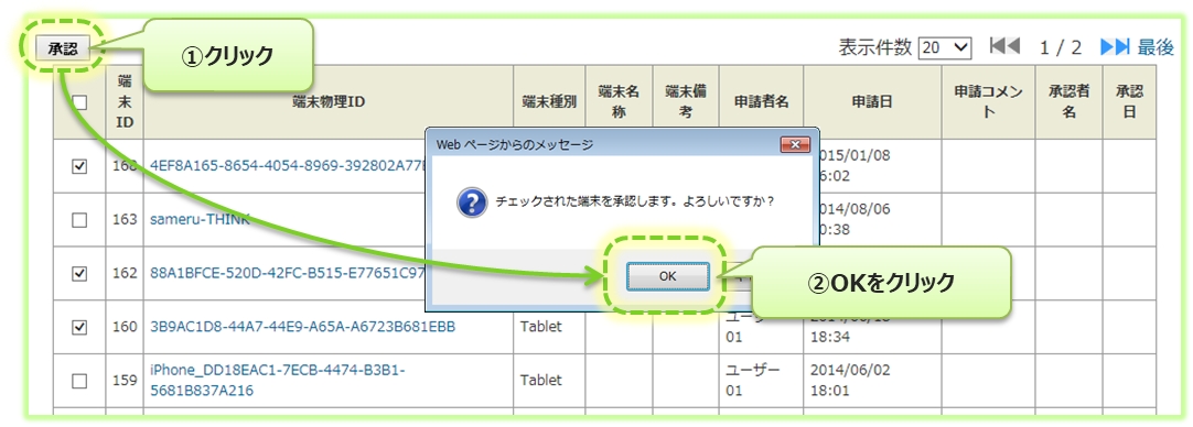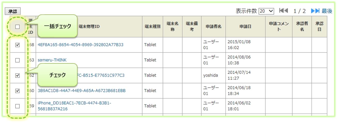 承認ボタンをクリックしてチェックした端末を一括承認します。
