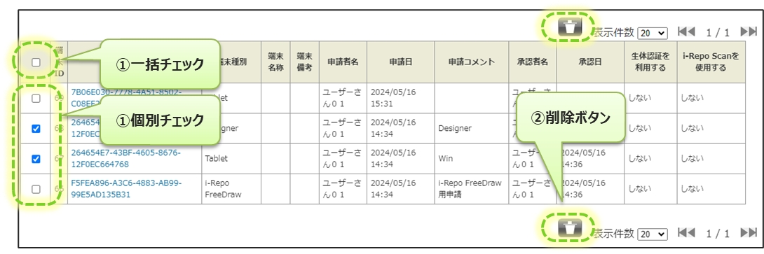 端末一覧ページで、削除対象端末にチェックを入れます。