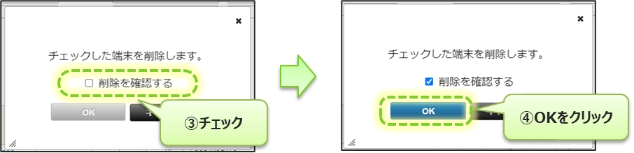 「OK」をクリックすると、端末一覧でチェックした端末が削除されます。