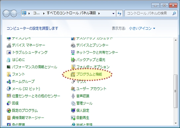 スタートメニューから「コントロールパネル」を選択してコントロールパネルを起動し、「プログラムと機能」をクリックします。