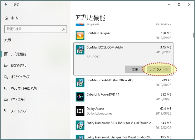 「アプリと機能」の一覧の中から「ConMas EXCEL COM Add-in」※ を選択し、「アンインストール」を実行します。