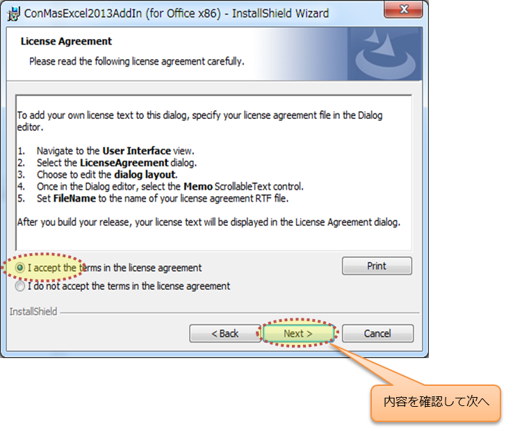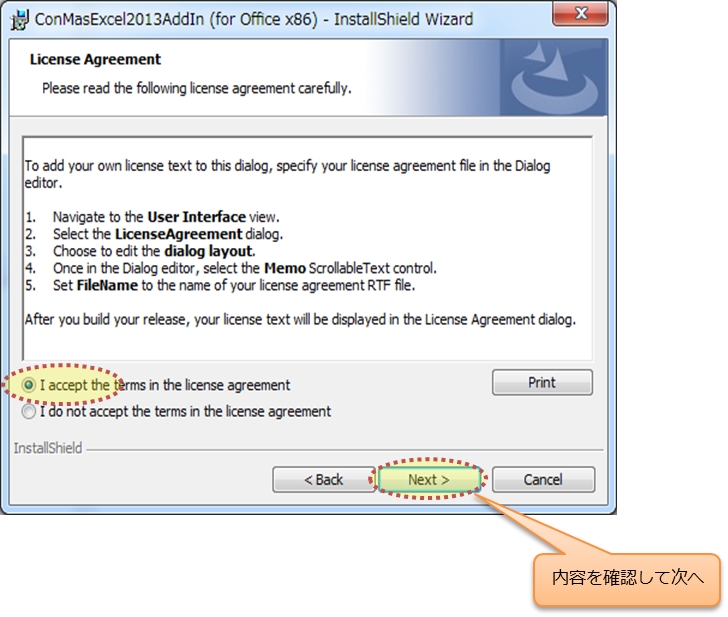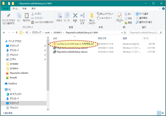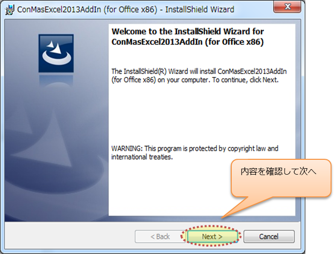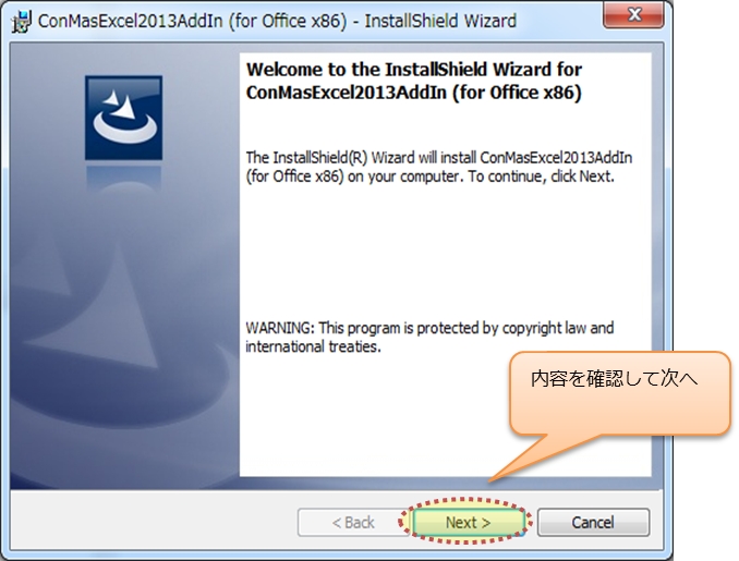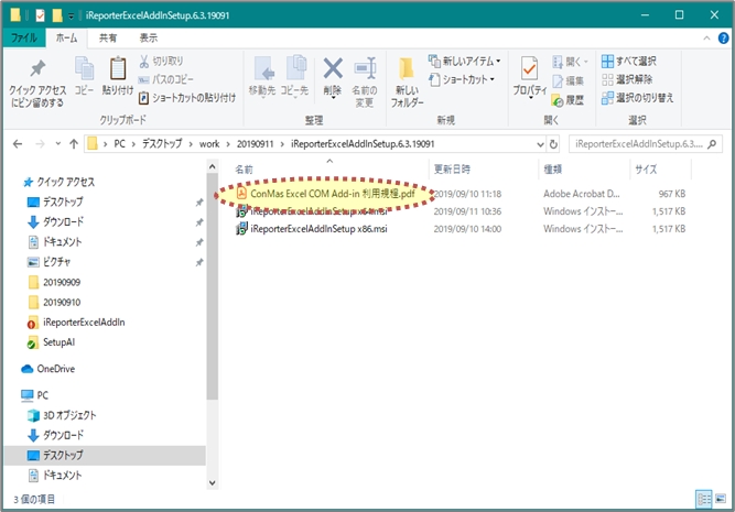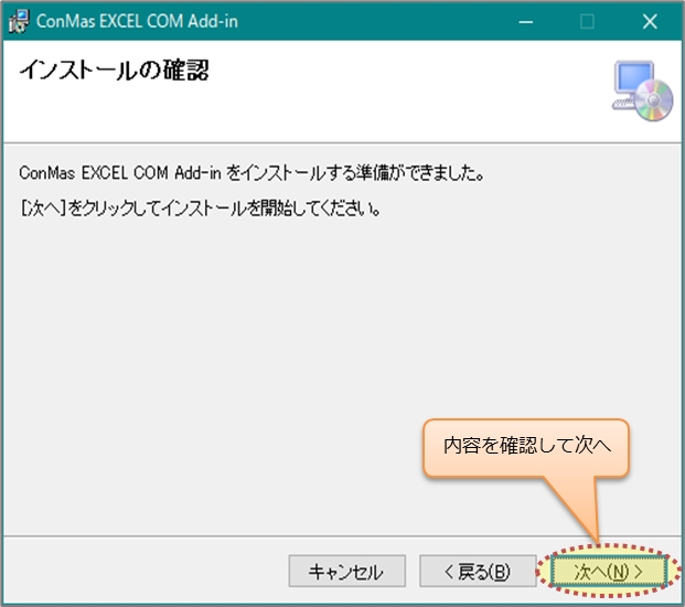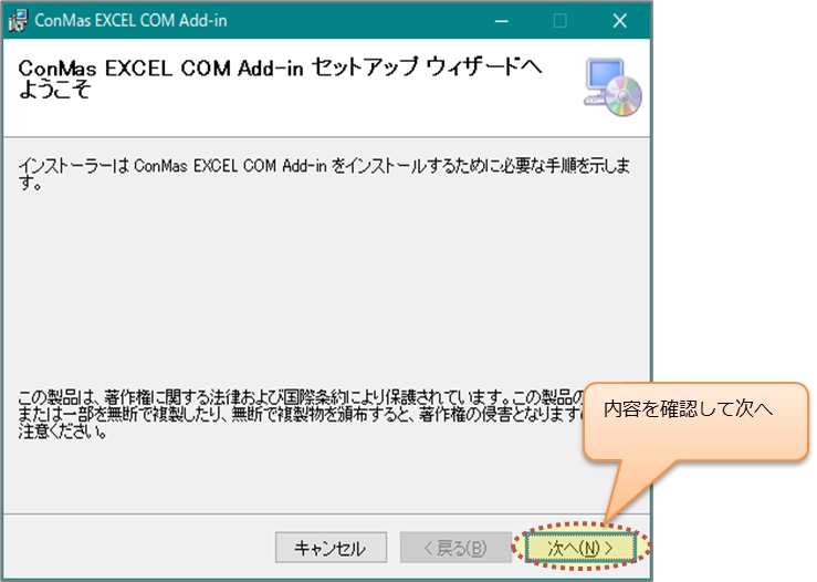 インストーラーと共に「ConMas Excel COM Add-in 利用規定.pdf」ファイルが同梱されています。 利用規定をご確認の上、インストールをお願いします。