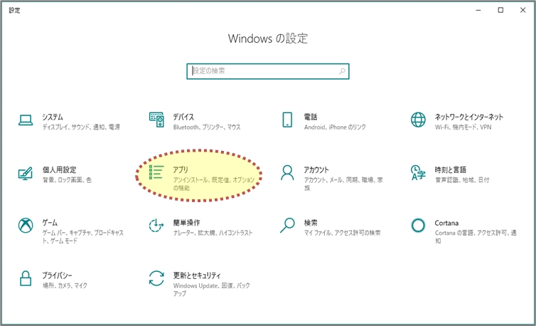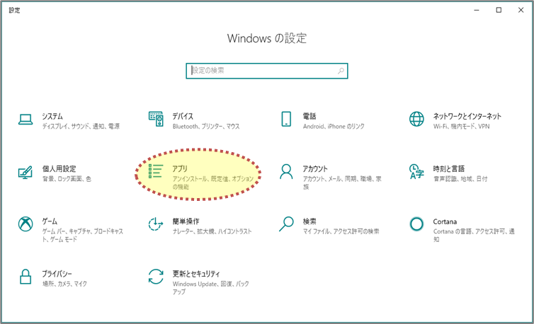 スタートメニューから「設定」アイコンをクリックしてWindowsの設定画面を起動し、「アプリ」をクリックします。