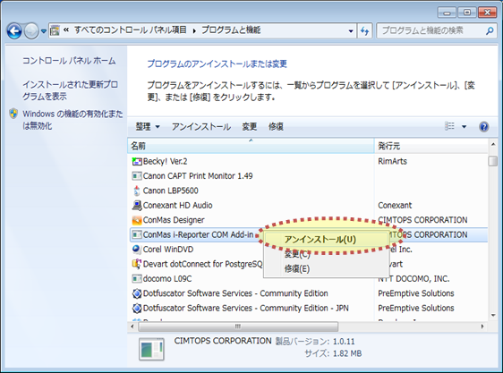 一覧の中から「ConMas EXCEL COM Add-in」※を選択して右クリックし、「アンインストール」を実行します。