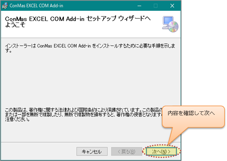 インストーラーを起動します。 内容を確認して「次へ」をクリックします。