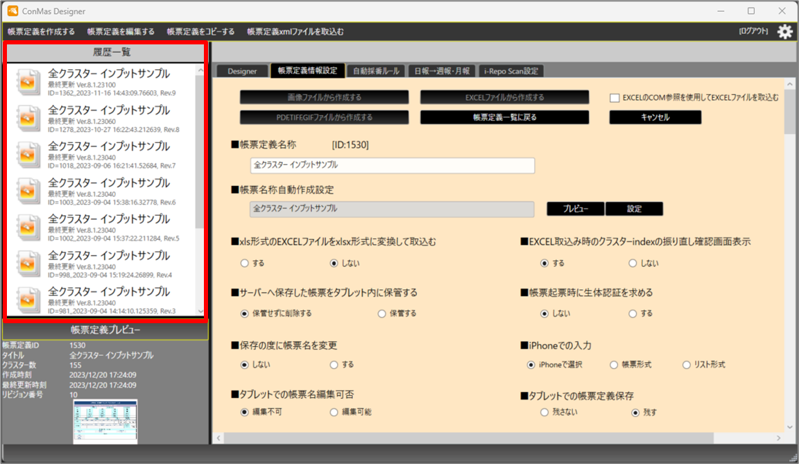 ConMas Designerの左側画面に「履歴一覧」が表示されますので、「入力帳票の「元帳票定義」の確認方法」 > 「定義IDが異なる場合」で確認した「定義ID(ID=XXX)」 の帳票定義をダブルクリックします。