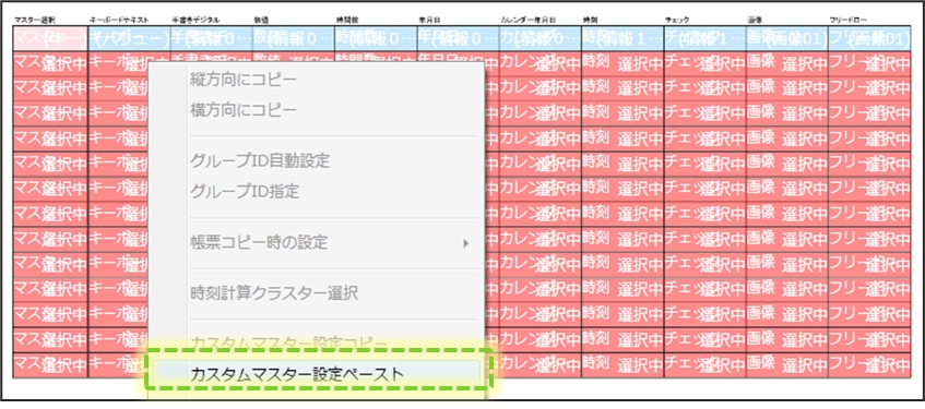 クラスターが複数選択された状態で右クリックメニューを表示し、「カスタムマスター設定ペースト」を実行します。