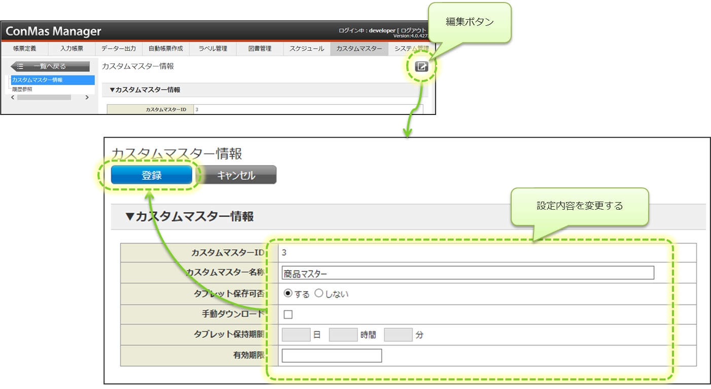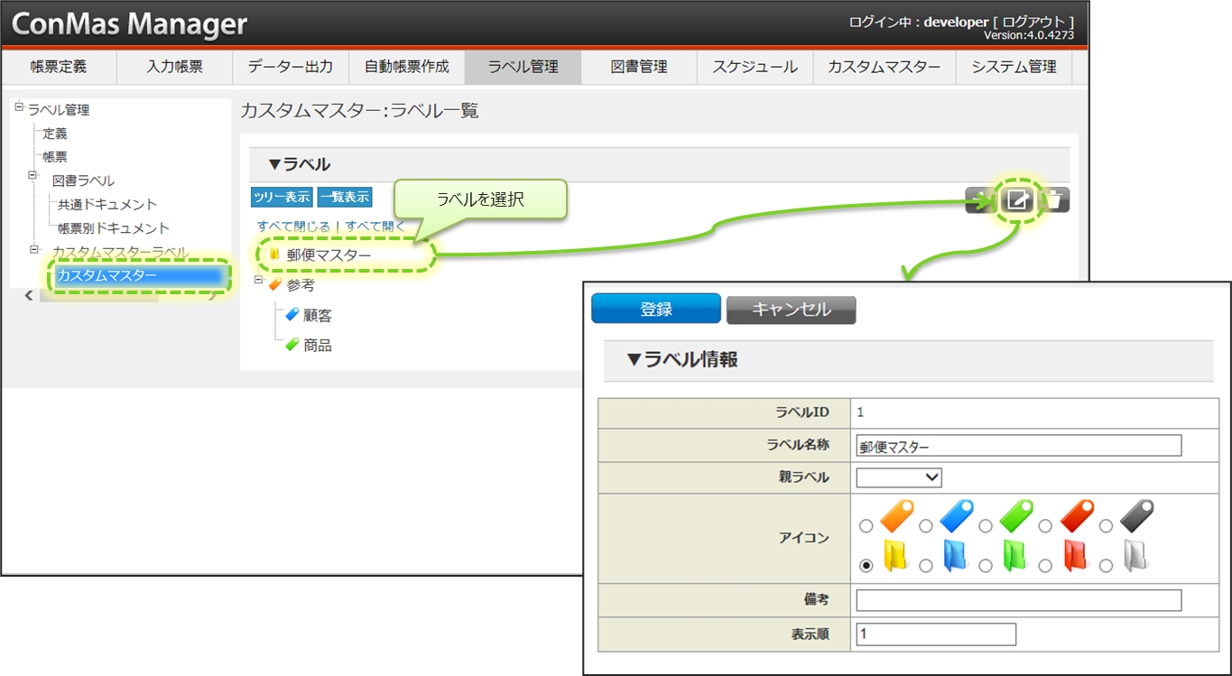 ラベル情報、グループ別権限情報を設定します。 「ラベル管理」画面の左ツリーにある、「カスタムマスター」をクリックします。 ラベルを選択し、「編集」ボタンをクリックします。