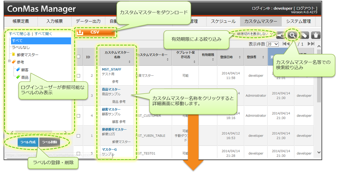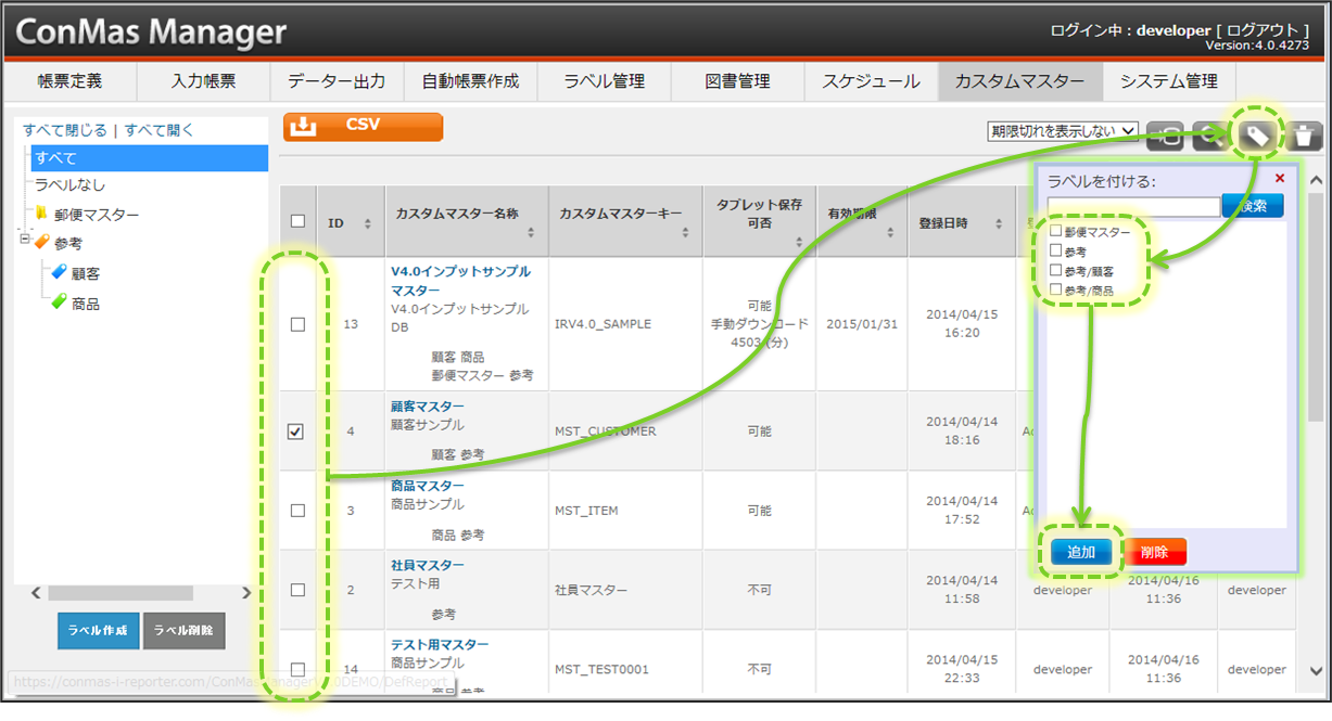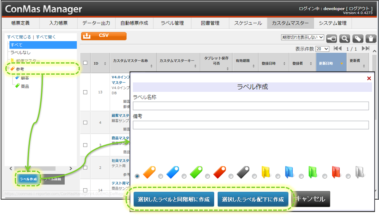 カスタムマスター一覧でのラベルの設定