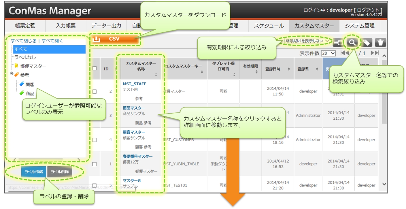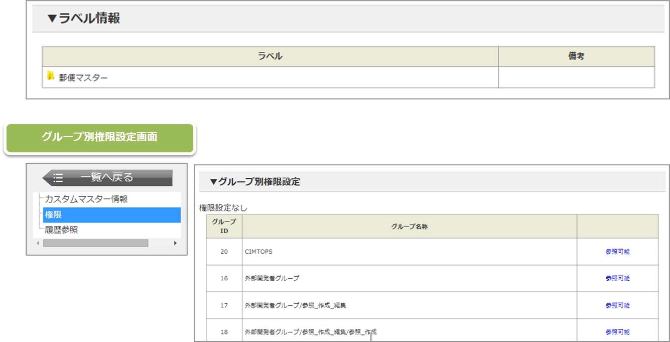 カスタムマスター情報画面で、ラベル情報、参照権限を確認できます。