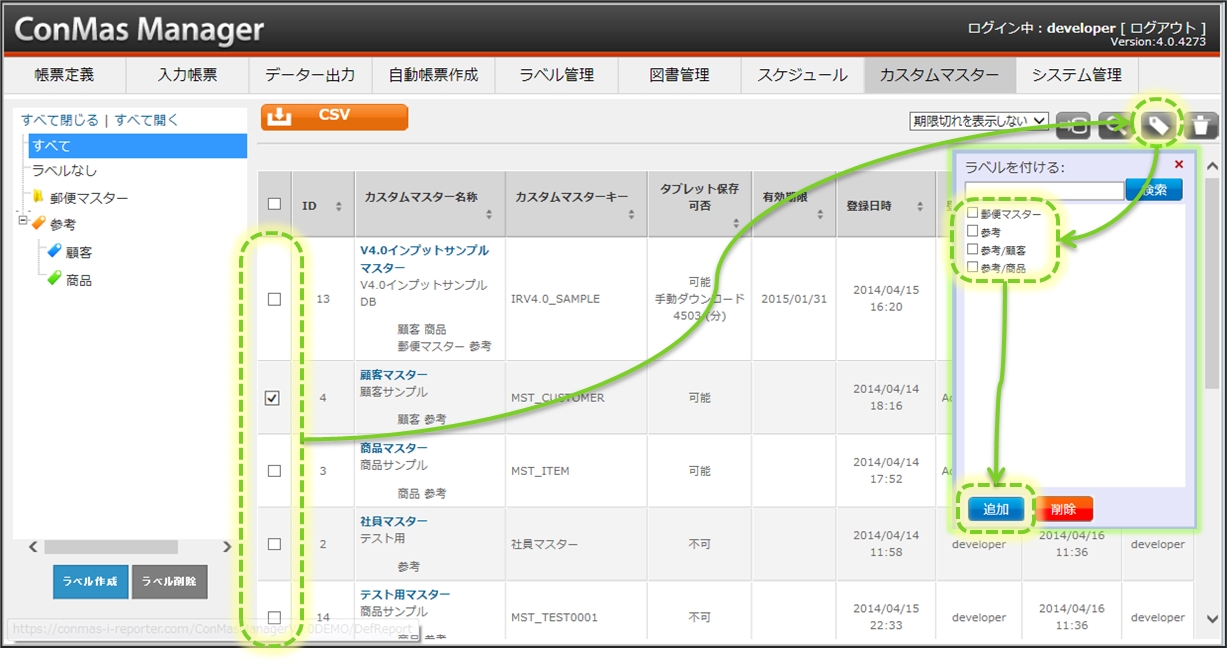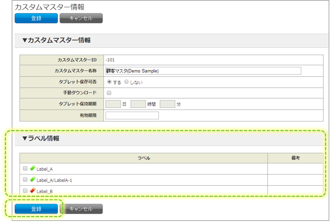 カスタムマスター情報の編集画面でラベルを設定する事ができます。 「ラベル情報」の一覧からつけたいラベルにチェックし、登録します。