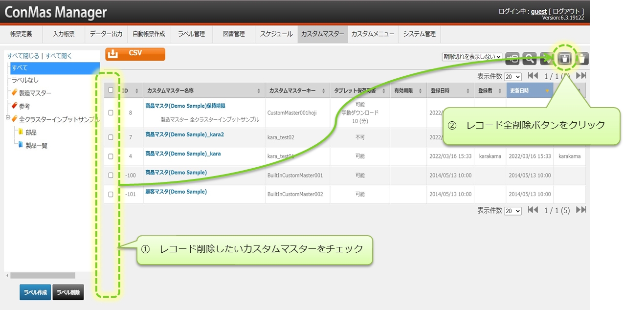 カスタムマスターのレコード削除は一覧画面で行います。 この削除は、削除対象となったカスタムマスター内の全レコードが削除されます。 カスタムマスター自体の削除は行いません。 帳票定義との紐づけはそのままに、レコード情報のみクリアしたい場合に便利な機能です。