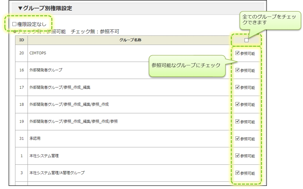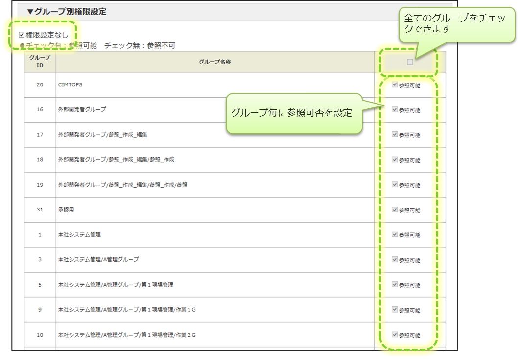 グループ別の参照権限を設定します。 「▼グループ別権限情報」で、グループごとにラベルの参照可否を設定します。 「権限設定なし」をチェックすると、すべてのグループで参照できるようになります。
