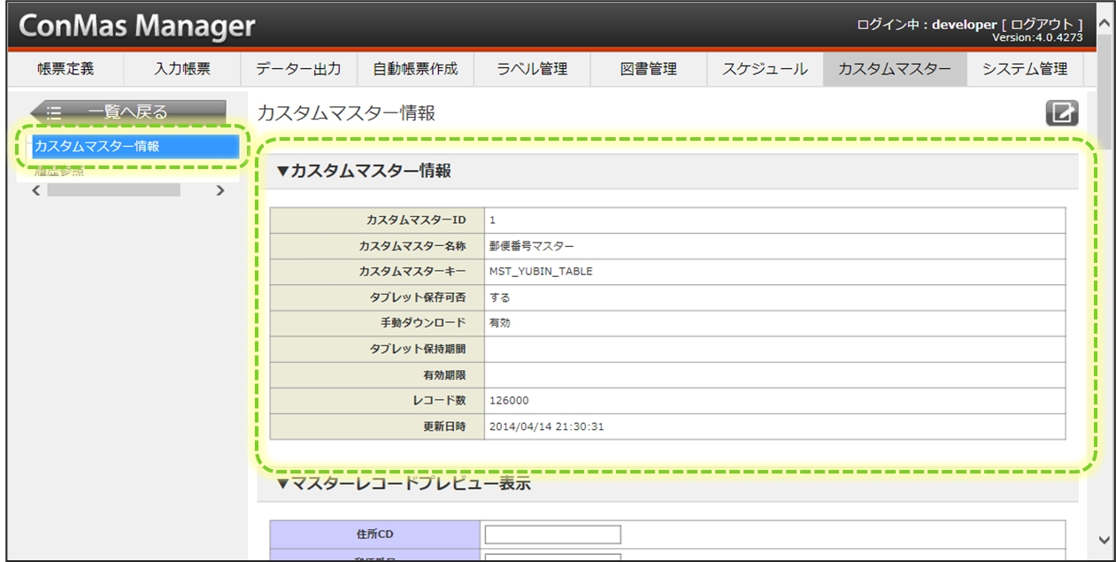 カスタムマスター情報画面では、詳細情報を確認できます。