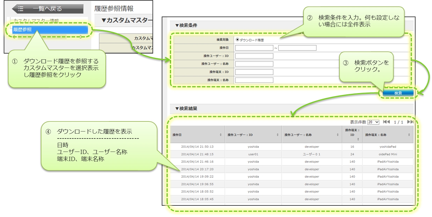 iPadへのカスタムマスターのダウンロード履歴をサーバー側で記録しています。 カスタムマスター別に、どのユーザーが、いつ、どの端末にダウンロードしたかをサーバー側で閲覧できます。
