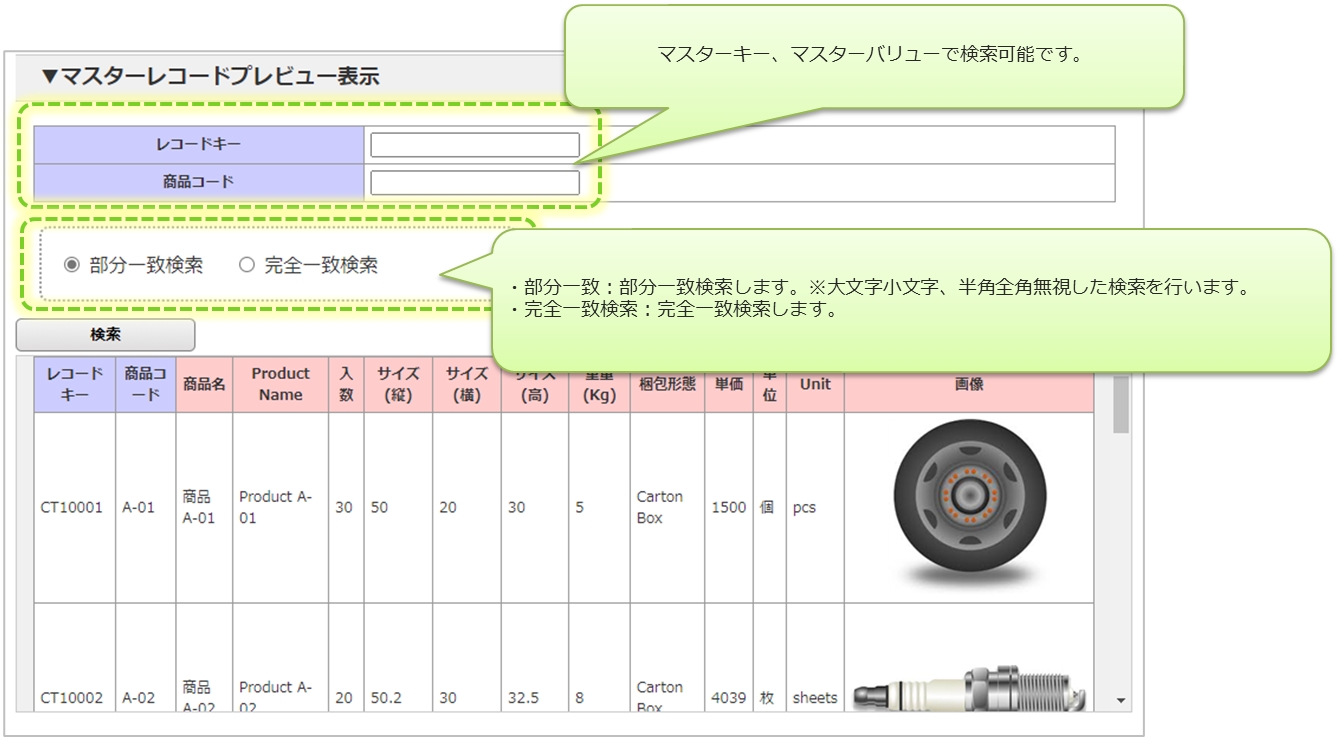 カスタムマスター情報画面で、最大10レコードまで内容を確認できます。 全レコード情報を確認するには、CSVダウンロードを行ってください。
